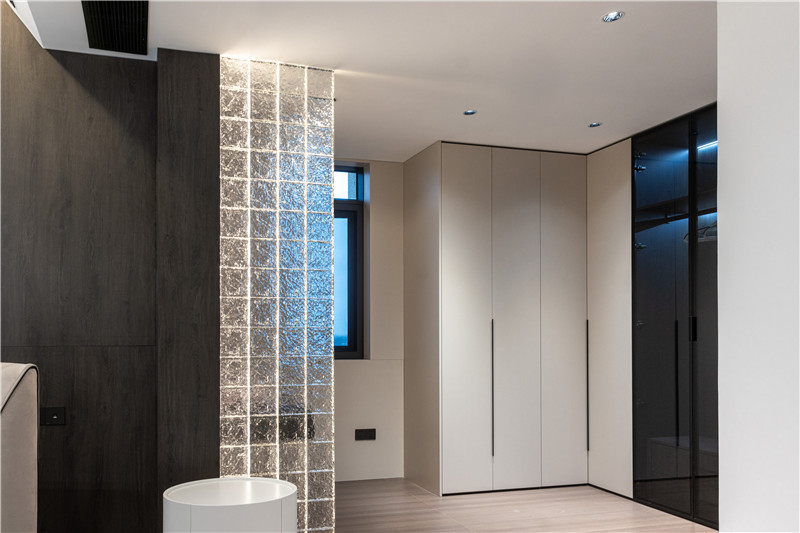 室內以夢幻玻璃磚隔出一個衣帽間,梳妝臺依屋主需求定制高度,側邊U型立柜作為收納區(qū),展示區(qū)與私密區(qū)區(qū)分,符合人體工程學設計。