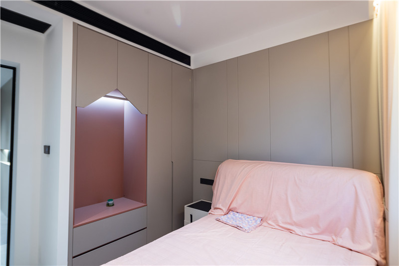 女兒房背景墻與衣柜一體化設計,中部做房屋造型并以粉色點綴,顯活潑靈動,這樣的溫馨小屋太讓人心動了吧~