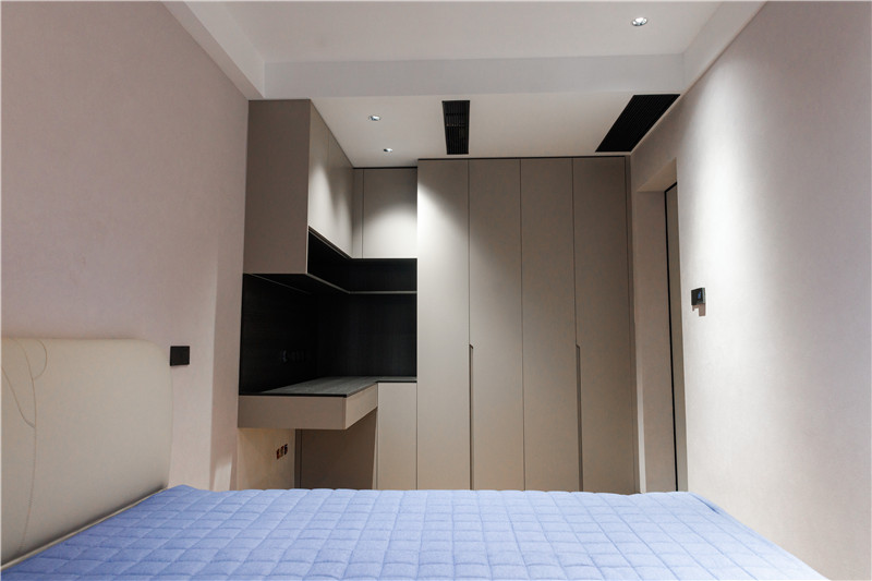 客臥兼書房使用,衣柜延伸為書桌,以懸挑設計突出特色。墻面采用了藝術漆,易擦拭,方便屋主整理清潔。