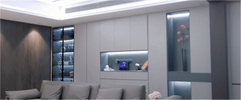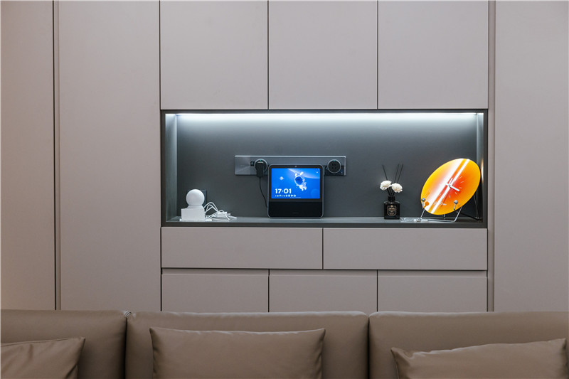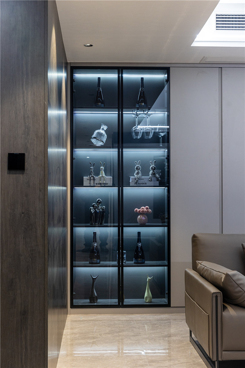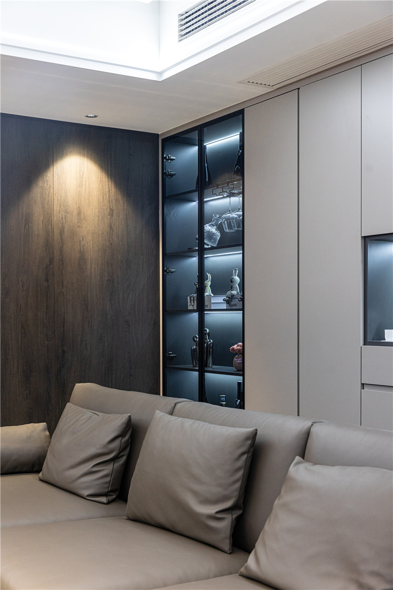一側(cè)玻璃展示柜,是手辦區(qū)亦是藏酒區(qū);一側(cè)穿插設(shè)計(jì)嵌入燈光,是家里的氛圍區(qū);中部整面立柜,在合適高度掏空并預(yù)留軌道插座,實(shí)用性強(qiáng)。