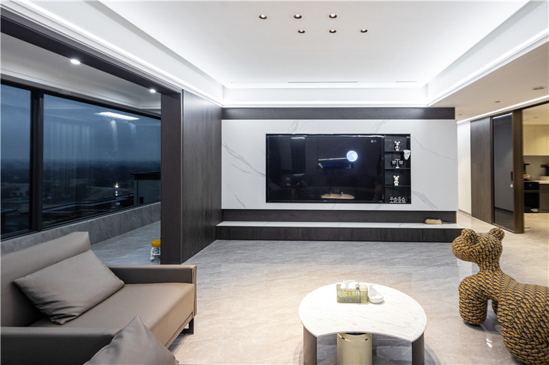 電視背景墻采用整面大理石紋背板,將電視機(jī)嵌入?yún)f(xié)調(diào)統(tǒng)一布局,側(cè)邊深調(diào)開放格放置裝飾擺件,突顯個(gè)性化;一字型電視底柜為無(wú)拉手設(shè)計(jì),是小物件及常用物品的存放地。
