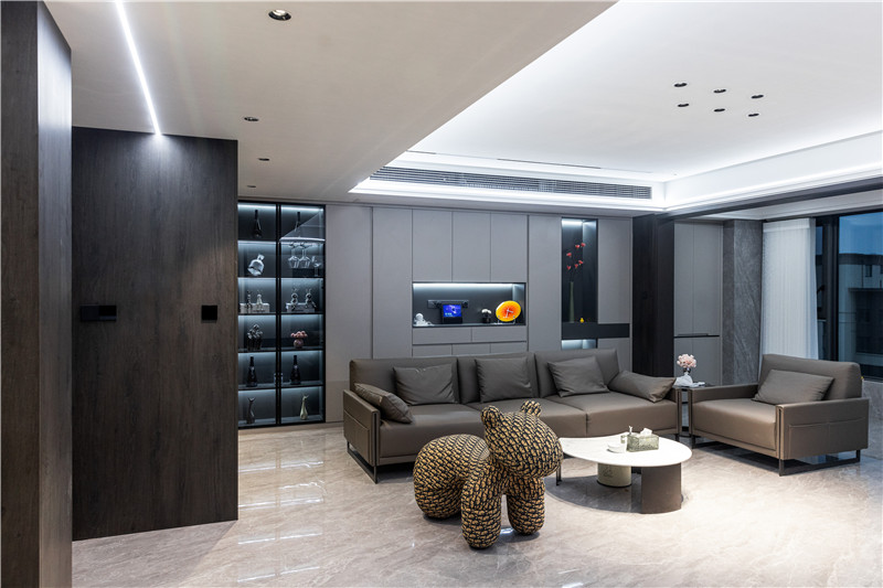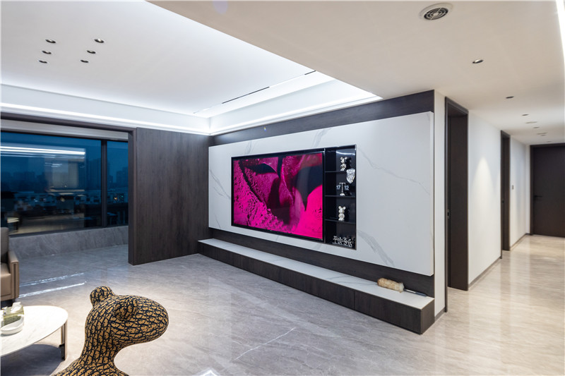 沙發(fā)背景墻為一字型到頂立柜,通過空間的合理利用增強(qiáng)收納力。