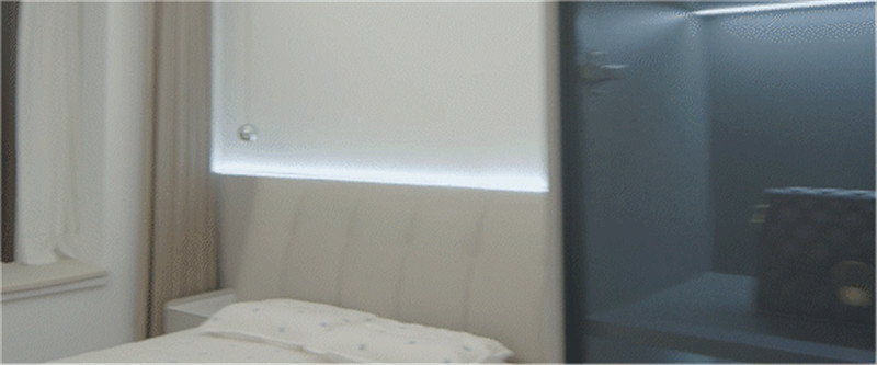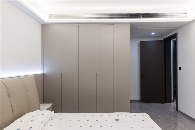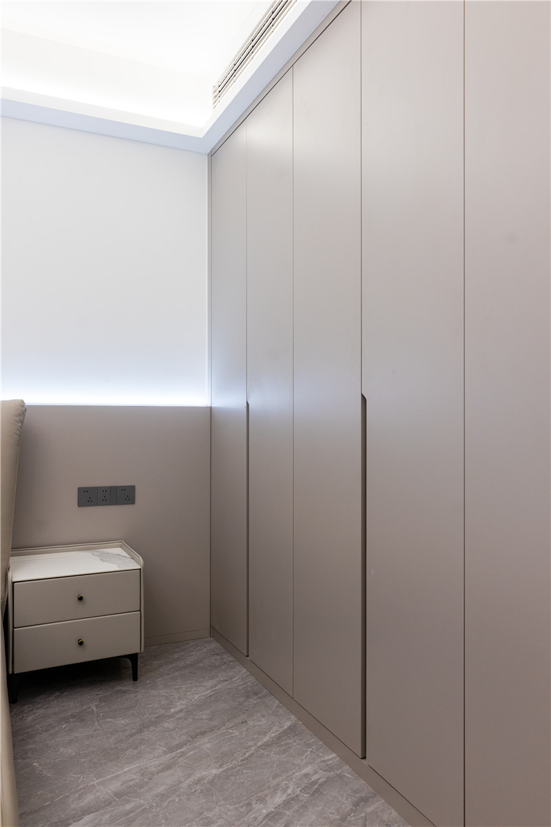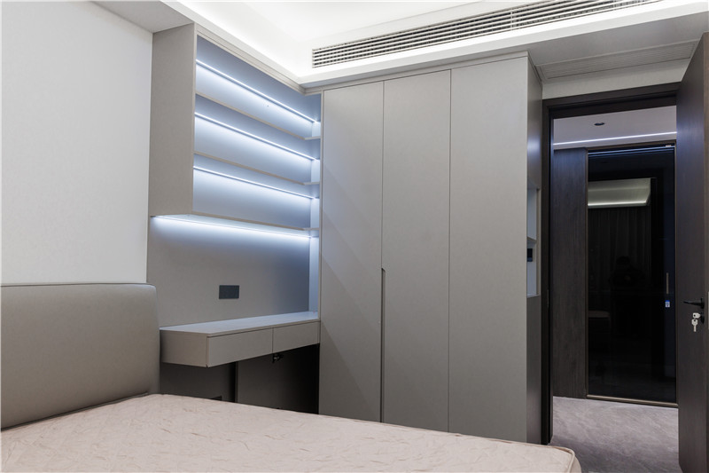 梳妝臺(tái)與床頭柜結(jié)合,上方做開放區(qū)并嵌入條帶燈,有效解決視覺死角問題;抽屜做無(wú)拉手,避免梳妝時(shí)的遮擋;側(cè)邊衣柜到頂設(shè)計(jì),邊角做薄側(cè)柜,存儲(chǔ)在線。