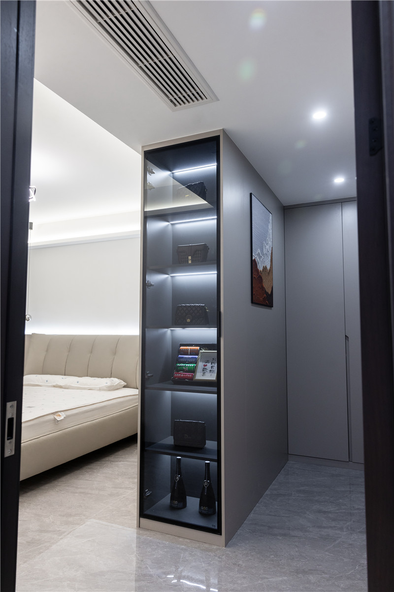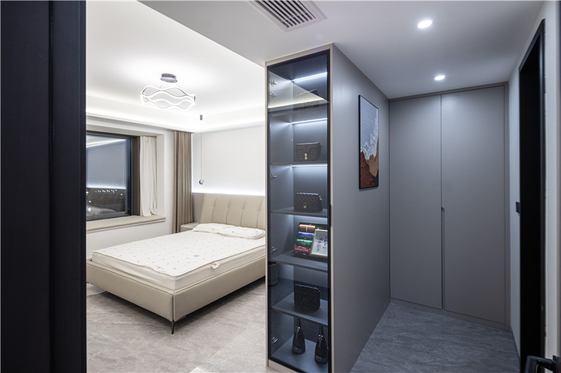 一組衣柜作為隔斷分離出小型衣帽間,一柜雙用突顯設(shè)計(jì)智慧;隔斷柜窄側(cè)玻璃柜展示,與眾不用;內(nèi)側(cè)立柜雙開,可根據(jù)屋主需求進(jìn)行合理分區(qū),為便捷高效的找尋助力。