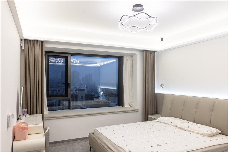 飄窗區(qū)鋪上毯子,鑄就休閑賞景一角;梳妝臺(tái)為組合柜體,以高度差異實(shí)現(xiàn)功能互補(bǔ);床頭背景墻色彩拼接,以輔燈點(diǎn)綴及藝術(shù)燈增強(qiáng)美感。