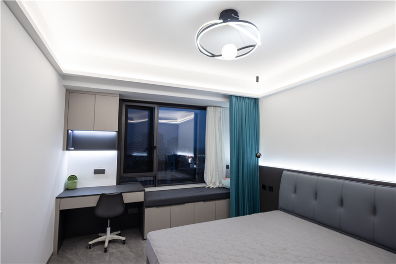 進(jìn)門靠墻立柜延伸床頭柜,內(nèi)側(cè)色彩協(xié)調(diào)以床頭背景墻,干脆利落;靠窗收納柜與書桌錯(cuò)位結(jié)合,便捷實(shí)用;整屋主燈與輔燈結(jié)合設(shè)計(jì),氛圍感在線。