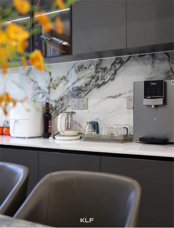 想要做到空間留白與有序收納的平衡,開(kāi)放式的開(kāi)放柜與深灰色色彩碰撞,形成不同而合的視觸覺(jué)體驗(yàn),意式極簡(jiǎn)風(fēng)之下,空間氛圍更顯寬敞。