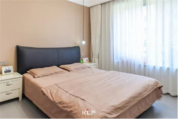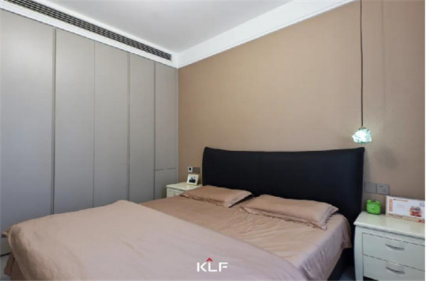 主臥一側(cè)到頂式衣柜,延展視覺(jué),搭配銑槽拉手,讓衣柜擁有小亮點(diǎn);內(nèi)部合理分區(qū),讓小空間的收納力不容小覷;靠床可做小型展覽柜,個(gè)性化裝飾。