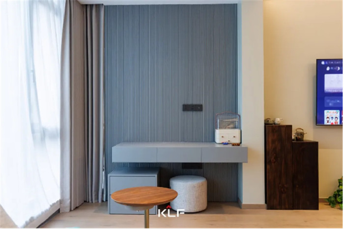 滿(mǎn)墻格柵設(shè)計(jì)增加舒適感,緩和輕奢風(fēng)帶來(lái)的疏離,讓空間更加和諧宜居,客廳無(wú)主燈設(shè)計(jì)讓空間更加寬闊明亮。