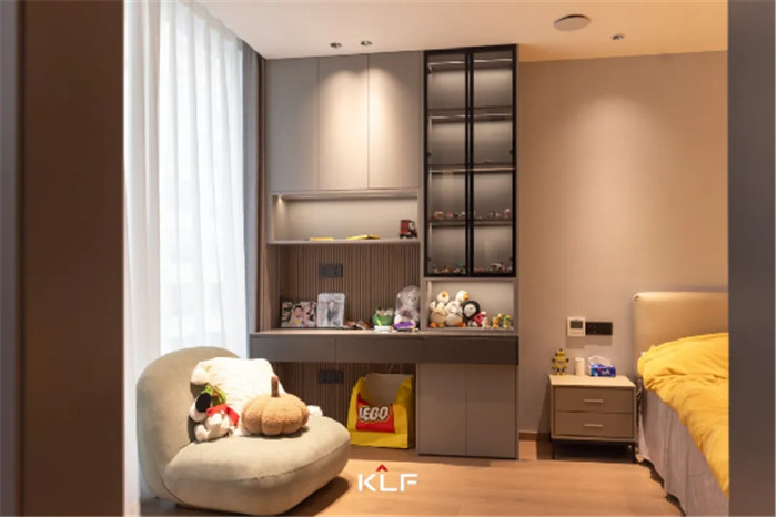 臥室設(shè)計(jì)中部不規(guī)則開(kāi)放柜,放置日常玩偶、手辦、模型等收藏品,符合使用者所需,同時(shí)為衣柜增加了精致與顏值。