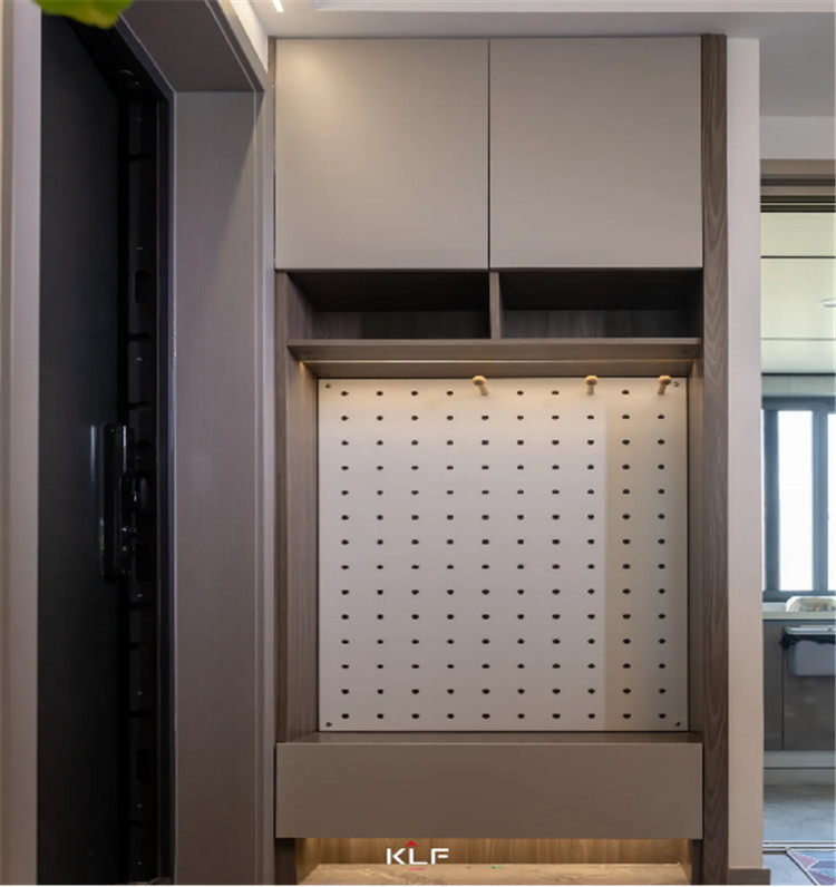 入戶在有限的空間中我們更注重整潔的收納,上方做吊柜,中部做抽屜進(jìn)行組合式儲(chǔ)物,屋主在背板上使用了洞洞板進(jìn)行小物品的存放,也是提高空間利用率的一種形式。