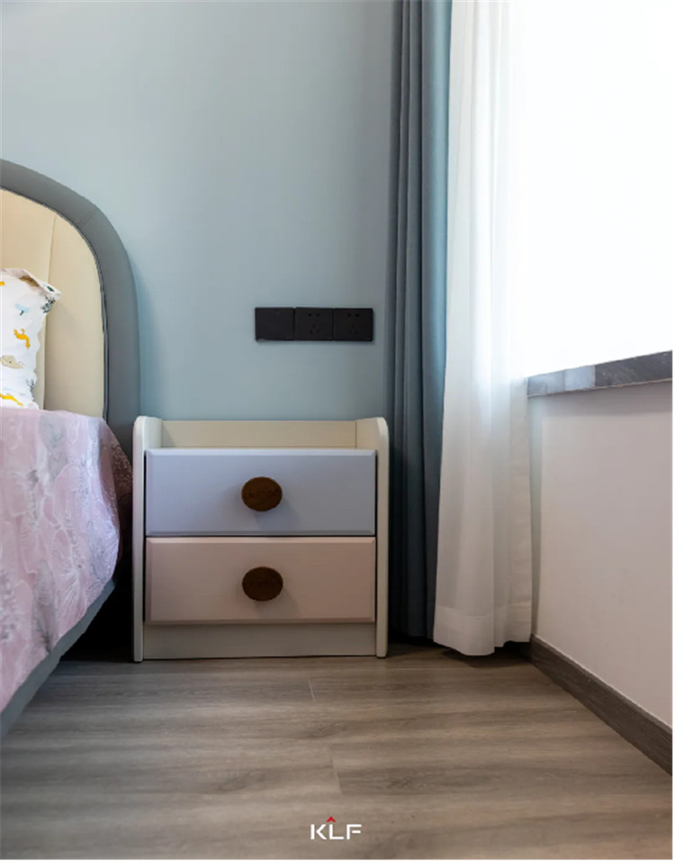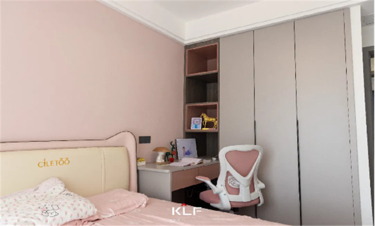在女兒房的設(shè)計(jì)上,屋主以粉色調(diào)和藍(lán)色調(diào)塑造了兩間次臥。在次臥中,除了日常生活的睡眠區(qū),在衣柜設(shè)計(jì)中加入了書桌的元素,讓衣柜與書桌一體化設(shè)計(jì),開放格可做書柜使用,整體和諧又節(jié)省空間。