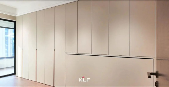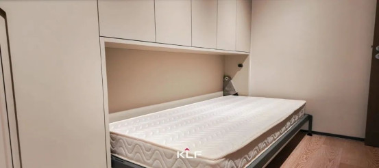 衣帽間采用“一門到頂”的設(shè)計(jì),柜體與墻面接縫處不留縫隙,減少衛(wèi)生死角。衣柜內(nèi)部結(jié)構(gòu)合理,分區(qū)明確。銑槽拉手柜門平整順滑,強(qiáng)迫癥黨看了表示超舒服。折疊床柜一體設(shè)計(jì)暗含巧思,打開(kāi)便是一張折疊床,偶有客人留宿不是問(wèn)題。