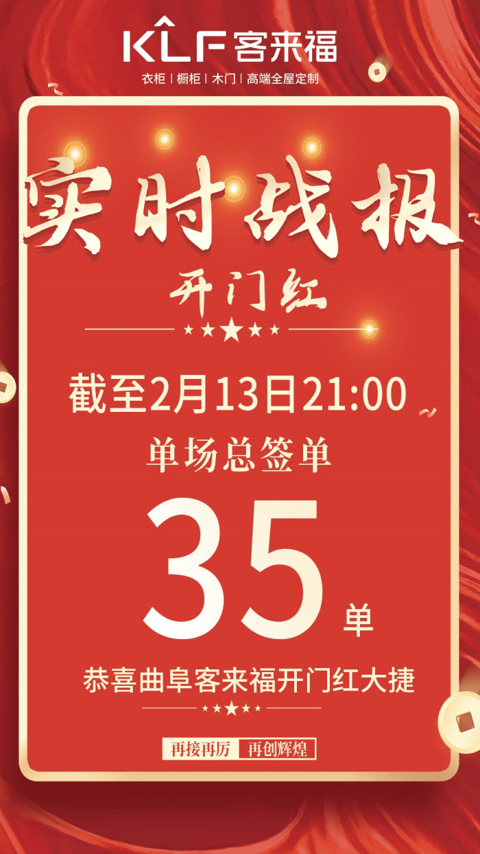 眾多客來福新款產(chǎn)品,款式新穎,時尚環(huán)保,個性化量身定制,吸引了眾多業(yè)主前來參觀咨詢,客來福新款產(chǎn)品得到業(yè)主們的肯定,下單火熱。截至2月13日,曲阜客來福門店取得了累計簽單35單的佳績。