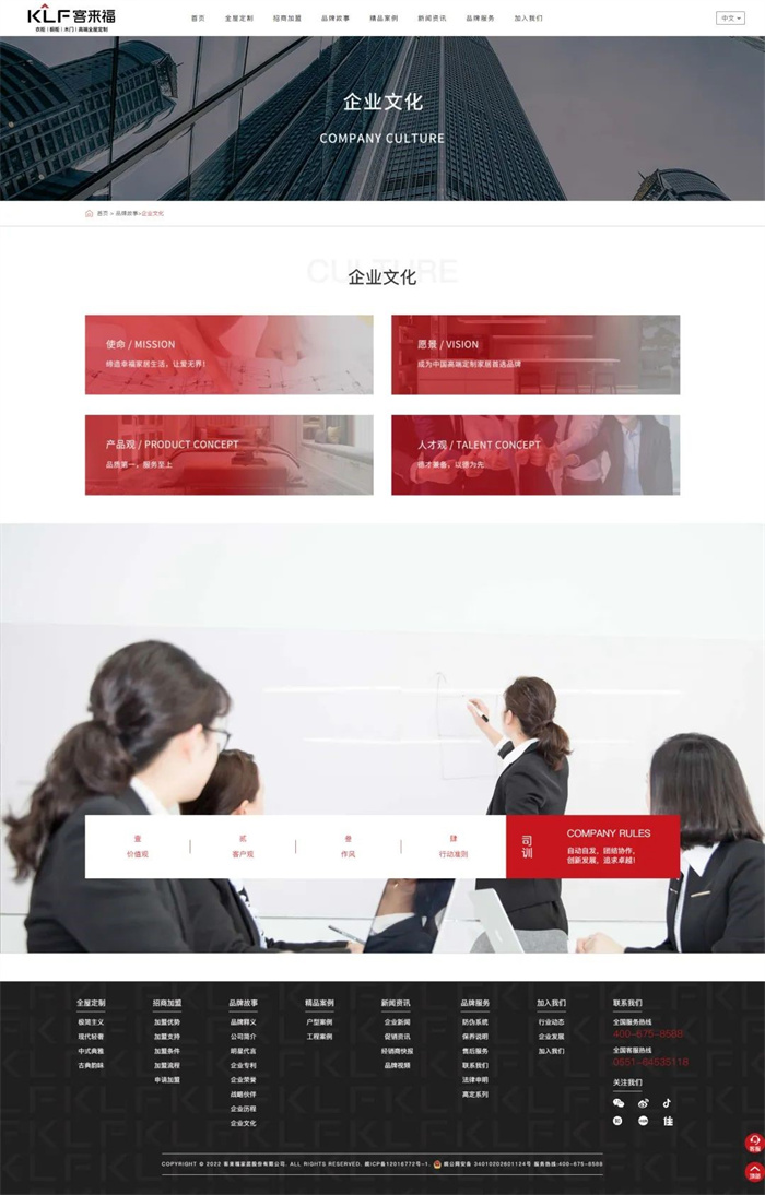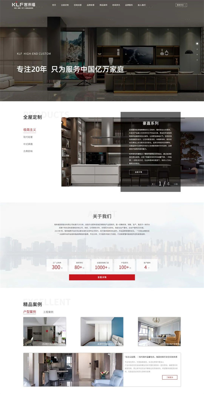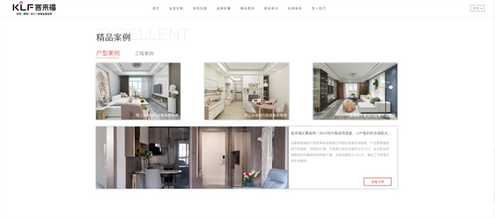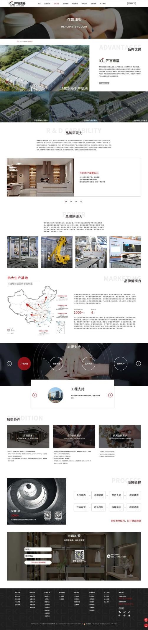 官網(wǎng)內(nèi)容定位上我們也進行了進一步明確,以“全屋定制、招商加盟、品牌故事、精品案例、新聞資訊、品牌服務(wù)、加入我們”七大版塊為主,分類清晰,排版主次分明。整體圖文并茂、便捷明了,讓用戶一鍵點擊,即可第一時間直觀了解到關(guān)于客來福最新的品牌信息。