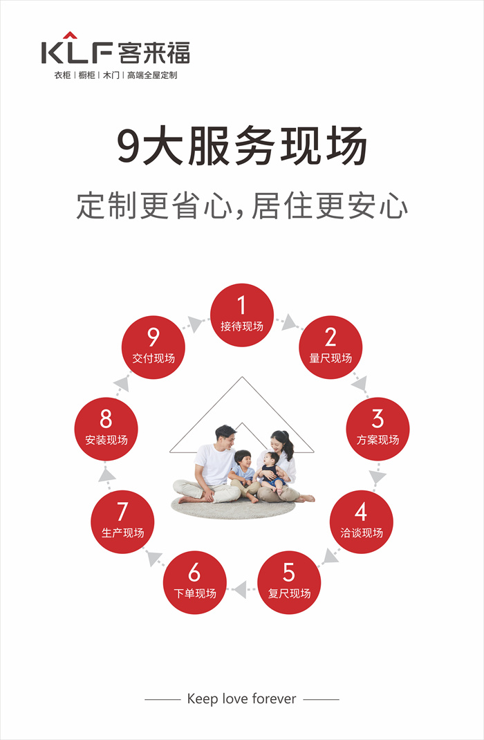 作為20年專注定制家居領(lǐng)域的知名品牌,客來福研究中國(guó)家庭的家居生活需求,為消費(fèi)者創(chuàng)造美好的生活環(huán)境,致力提升每個(gè)中國(guó)家庭的生活品質(zhì),確保產(chǎn)品迭代速度、產(chǎn)品健康性以及產(chǎn)品品類的多選擇性。同時(shí),客來福完善的流程,貼心的售后,全流程服務(wù),裝修信息可視化,白手套工程讓消費(fèi)者在定制家居的過程中更省心。