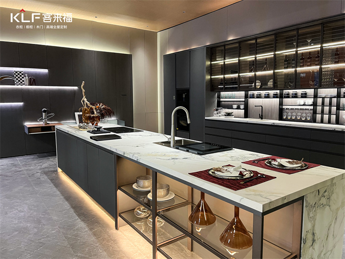 時(shí)尚、年輕、“放空”的空間,讓生活充滿情調(diào)。憑借著金屬的時(shí)尚+低飽和度莫蘭迪門板元素,將整體的空間打造出婉約直達(dá)內(nèi)心的意境,為參展觀眾展現(xiàn)了客來福強(qiáng)大的產(chǎn)品多元化實(shí)力。