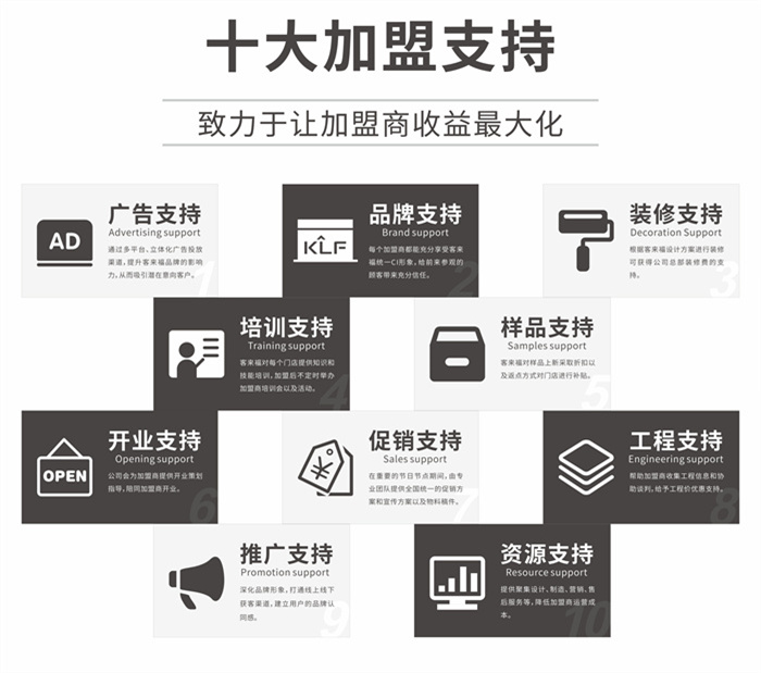客來(lái)福專注產(chǎn)品研發(fā),在定制家居行業(yè)中力爭(zhēng)上游,是一家集研發(fā)、銷售、生產(chǎn)、售后于一體的大規(guī)模個(gè)性化定制家居品牌。如今,面對(duì)市場(chǎng)衍生出的新需求,客來(lái)福洞察新的發(fā)展機(jī)遇,以全新的商業(yè)模式,四大優(yōu)質(zhì)保障,五步無(wú)憂經(jīng)營(yíng)以及十大加盟支持,給予每一位加盟商放心、安心、良心的加盟支持,更滿足消費(fèi)者不斷變更和升級(jí)的家裝需求。