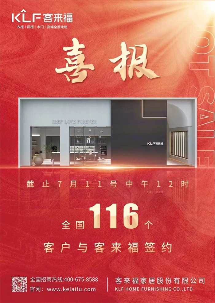 此次展會(huì)截止7月11日中午12時(shí),客來(lái)福與全國(guó)共116個(gè)新客戶簽約,優(yōu)渥的實(shí)力才是強(qiáng)大的核心??蛠?lái)福全體家人共同奮進(jìn),在時(shí)代的洪流中重振旗鼓,突破下一個(gè)定制家居新階段!
