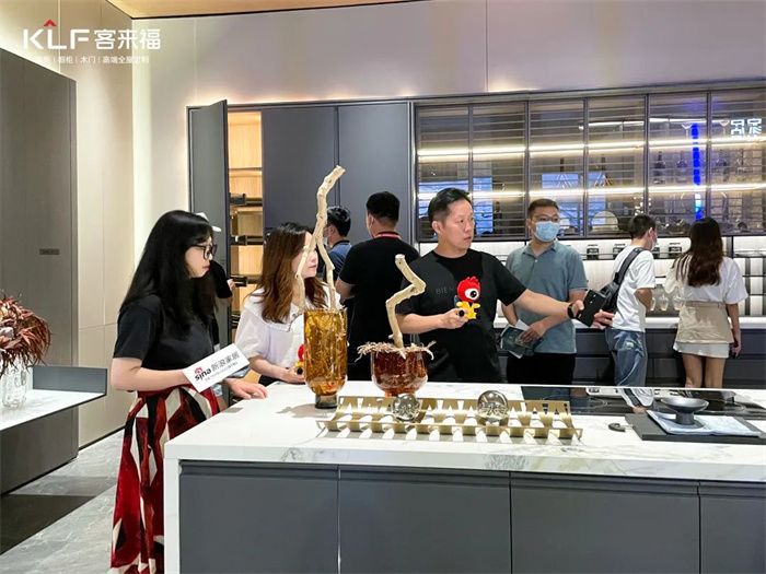 尹其宏董事長介紹道:客來福在此次展會、也是在行業(yè)內,首次重磅推出水漆實木系列產品。最值得一提的是“天琛”系列色板的水漆半透工藝。從制作工藝上講,采用了目前行業(yè)內最領先的半透工藝——“見木不見漆”,木飾面與膚感PET的結合櫥柜。從水漆入手,水底水面,采用實木材質,看得到木皮但看不到油漆,近看可以清晰看出木紋通透的紋理感;0度膚感的觸覺,體驗進一步升級了產品的質感。