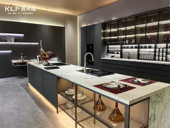 將客廳與開放式廚房打造成整體空間是升級的亮點之一,PET的工藝幫助我們實現嵌入式的內置功能,比如衛(wèi)生間的燈光和冰箱。除此之外,整家定制也是客來福今年的著力點,多功能的產品柜和開放式的設計模糊了空間界限。根據消費者對于一站式一體化的消費需求提供了解決方案。