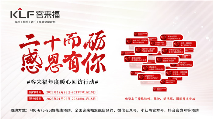 想要參與客來福一年一度的“感恩行動”,只需在2023年1月10日前進行報名預約,客來福家居將積極走進更多家庭,切實維護產(chǎn)品性能,讓家人們安心過年,幸福過年!