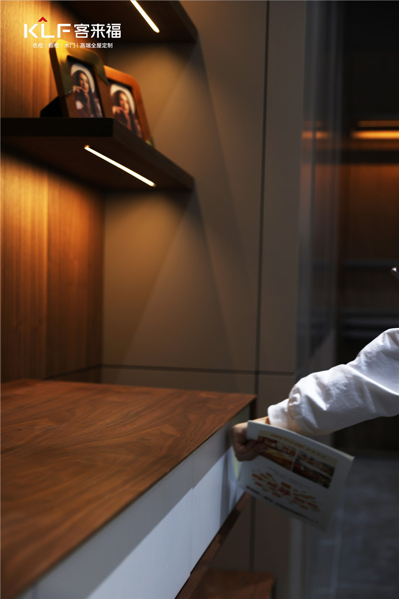 水漆工藝的運(yùn)用,使「臻·至」系列具有健康、環(huán)保的特性,從內(nèi)而外散發(fā)出高雅氣質(zhì),特有的“見木不見漆”效果在部分空間中帶來自然原生態(tài)的舒適感,折射出客來福一直踐行的健康整家定制理念。