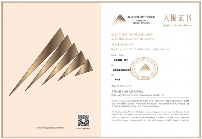 近日,2023年喜馬拉雅?設(shè)計(jì)之巔獎(jiǎng)隆重盛啟,客來福定制家居受邀參與評(píng)選,在近千幅參評(píng)作品中脫穎而出。旗下作品“蝶變”系列入圍定制家居設(shè)計(jì)獎(jiǎng)、作品“臻·至系列”入圍居住空間設(shè)計(jì)獎(jiǎng)、作品“水晶蝴蝶”拉手入圍高定材料設(shè)計(jì)獎(jiǎng),得到了評(píng)審的一致好評(píng)。實(shí)力彰顯中國品牌設(shè)計(jì)力量。