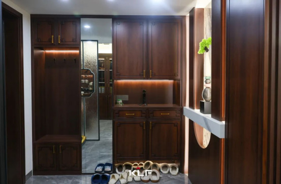 玄關(guān)柜以沉穩(wěn)的胡桃木色構(gòu)建視覺基底,通頂穿衣鏡迎接歸家步履;柜體底部鏤空,方便換取常穿鞋履;中部鏤空,能隨手放鑰匙等物品。柜門摒棄繁復(fù)紋飾,突出溫潤質(zhì)感,暗合“以簡為貴”的中式審美內(nèi)核。