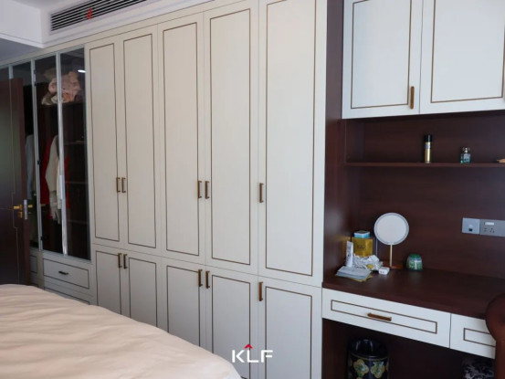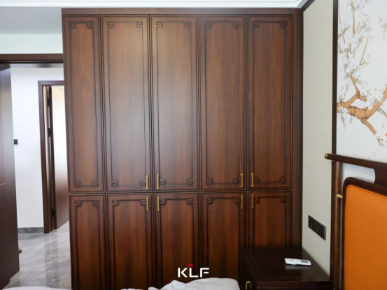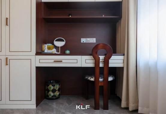 定制床尾柜,柜體盡頭采用進(jìn)退手法劃分出懸浮梳妝區(qū),“上掛下抽”布局進(jìn)一步豐滿視覺層次感。滿墻收納系統(tǒng)消隱于簡約柜門之后,呈現(xiàn)新中式主義“形式追隨功能”的終極解答,打造材質(zhì)碰撞的私屬領(lǐng)域,構(gòu)建居寢合一的復(fù)合場景。
