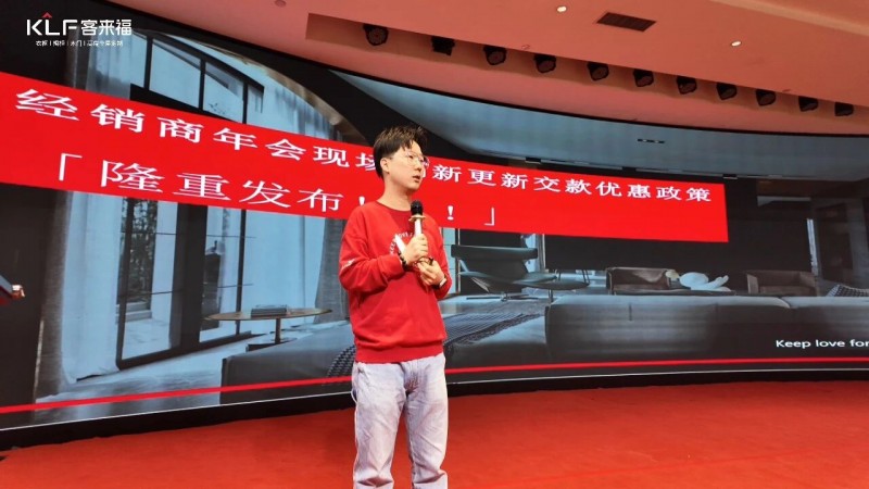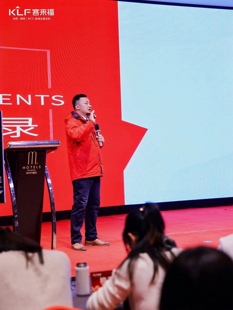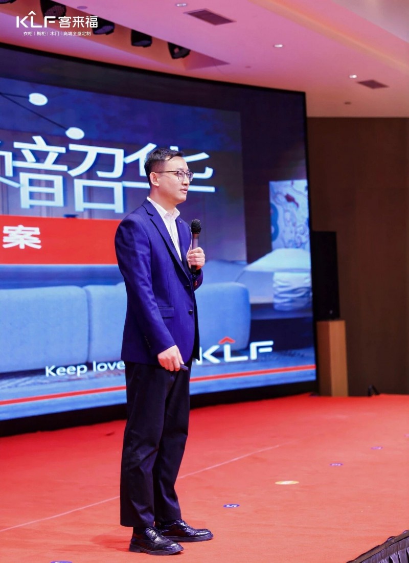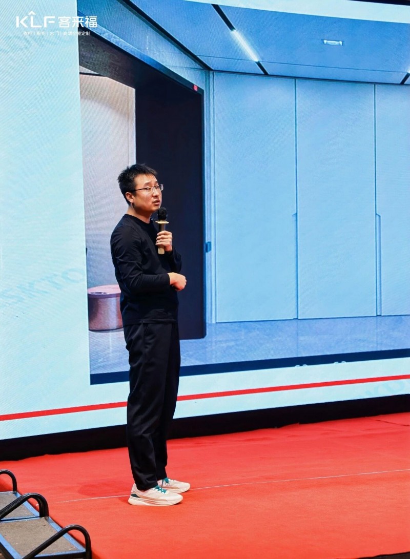 在熱烈的掌聲中,客來福商研部研發(fā)總監(jiān)劉云輝先生登臺,為全場經(jīng)銷商帶來了2026年度新品深度解析。從核心板材五金到前沿色彩搭配,再到整體空間解決方案,系統(tǒng)闡述了新品的競爭優(yōu)勢與匠心設(shè)計(jì)。干貨滿滿的分享,令在座合作伙伴對年度新品矩陣與市場前景有了清晰認(rèn)知,信心倍增。