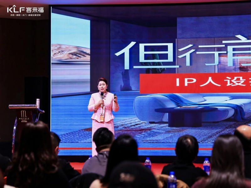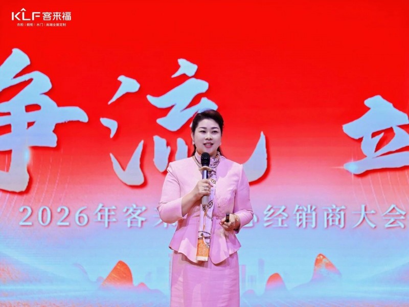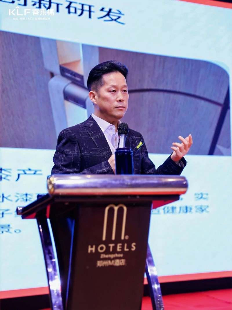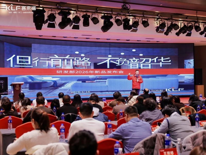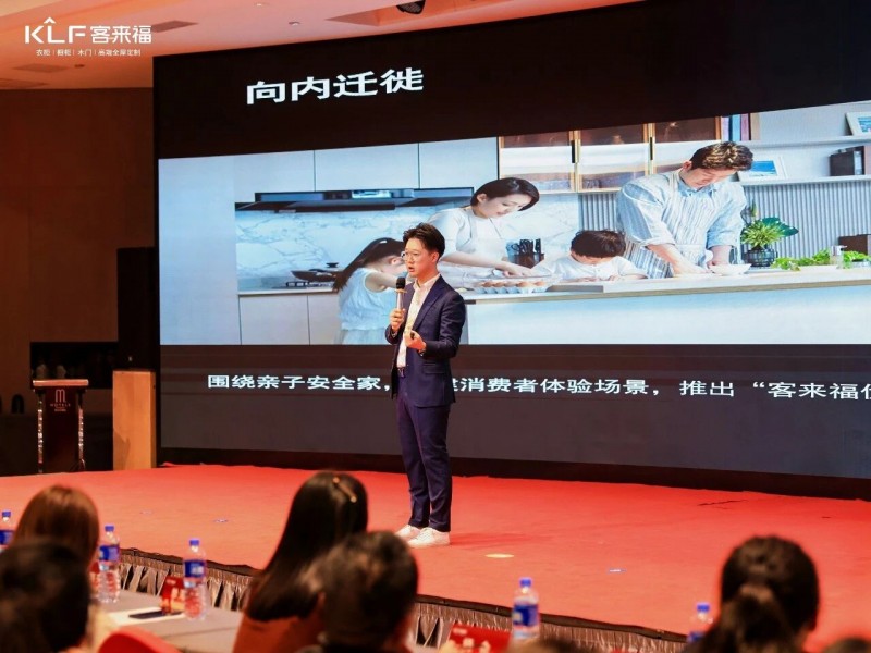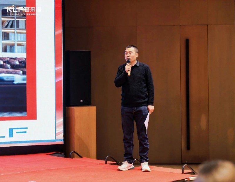 在熱烈的掌聲中,客來福商研部研發(fā)總監(jiān)劉云輝先生登臺,為全場經(jīng)銷商帶來了2026年度新品深度解析。從核心板材五金到前沿色彩搭配,再到整體空間解決方案,系統(tǒng)闡述了新品的競爭優(yōu)勢與匠心設(shè)計(jì)。干貨滿滿的分享,令在座合作伙伴對年度新品矩陣與市場前景有了清晰認(rèn)知,信心倍增。
