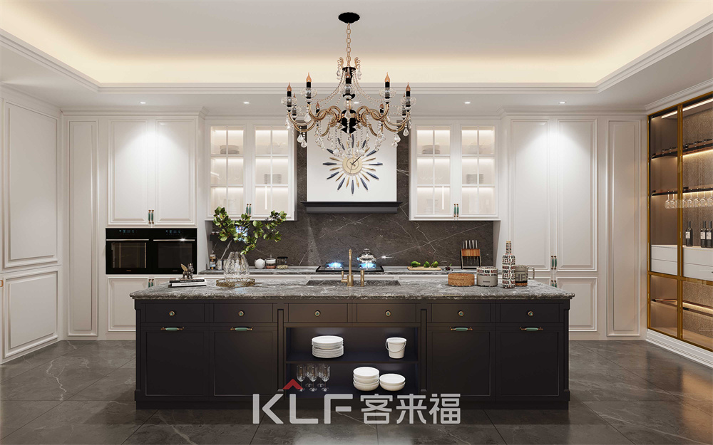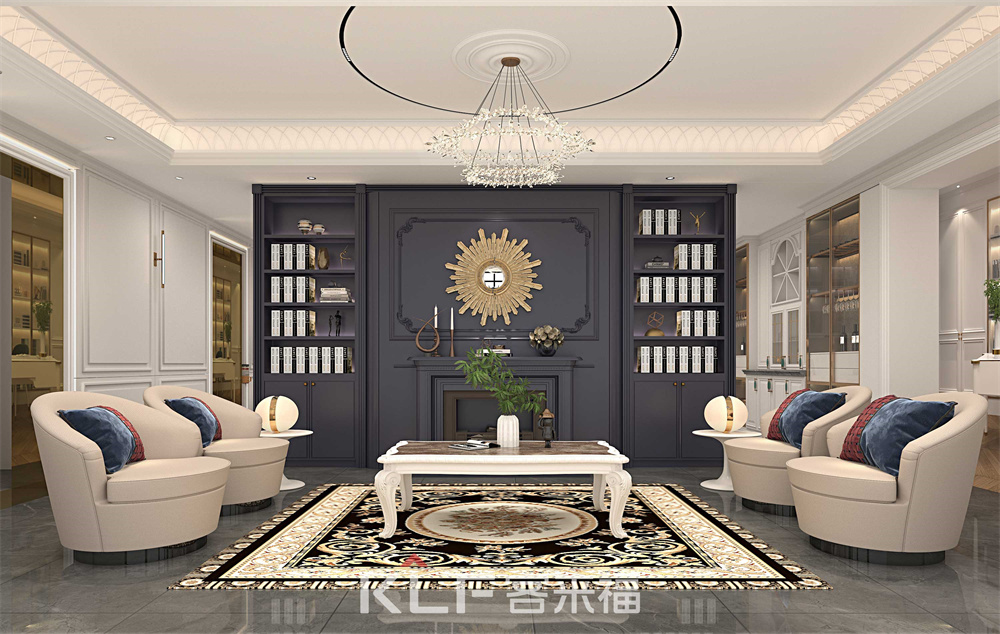 超長的中島臺,采用古典邊型的石英石臺面,灰藍色整體配色沉穩(wěn)大氣,餐邊柜采用巖板背板,是古典混搭系列的點睛之筆,客廳空間同樣采用雙色配套,壁爐柜的使用更是時下豪宅的標(biāo)配。