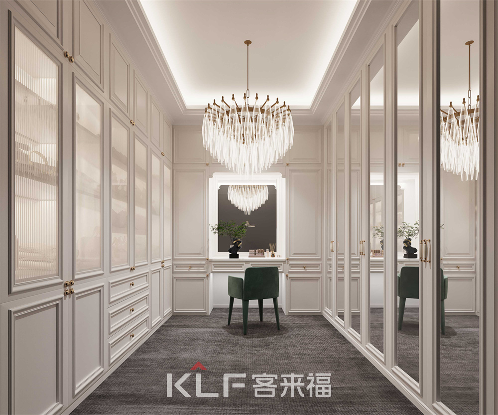 衣帽間配備雙開玻璃門,長虹玻璃搭配銀鏡的衣柜門板組合,將整個古典衣帽間功能分區(qū)更加合理,太陽花金色拉手的使用,既能體現(xiàn)古典產(chǎn)品的元素特征,同時也是現(xiàn)代感極強的一種體現(xiàn)。