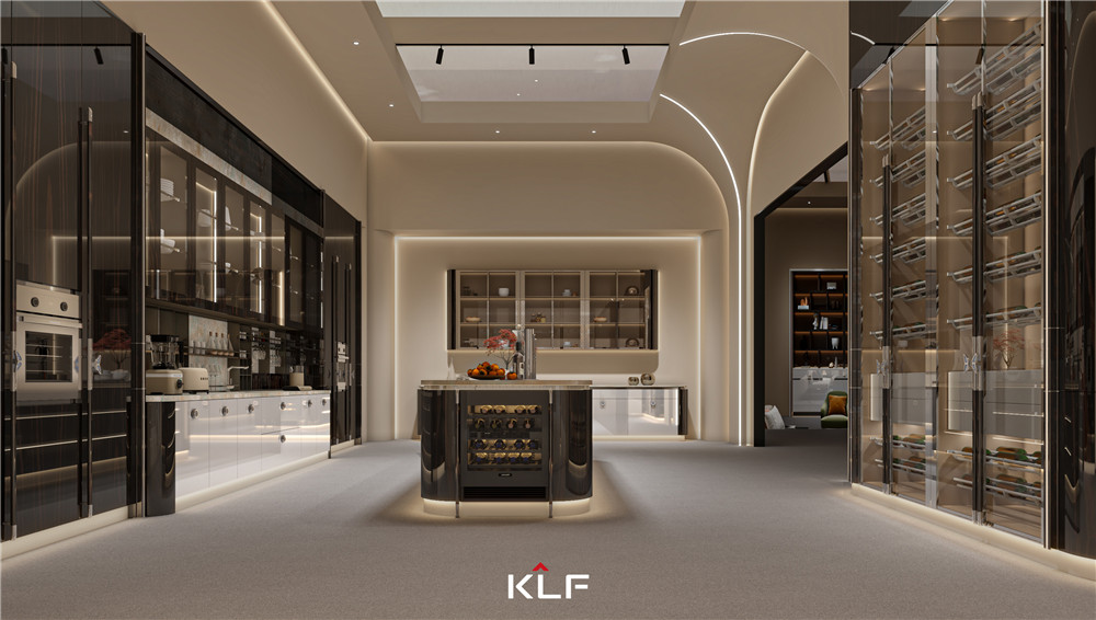 顏色上以白橡小山木紋搭配玻璃來(lái)呈現(xiàn)出輕奢,氛圍燈光渲染出柔暈光線,增加層次感;獨(dú)特的“F”品牌標(biāo)簽拉手,寓意“?!?;掛衣桿以KLF中的“K”為靈感,打造了一個(gè)具有品牌辨識(shí)度的蝴蝶掛衣桿。