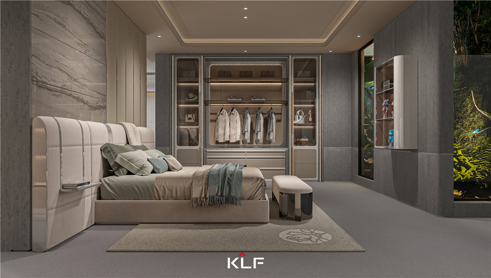 臥室背景墻以高級(jí)灰為主,金屬線條裝飾,營(yíng)造出悠閑的空間氛圍;衣柜背板采用了客來(lái)福LOGO 標(biāo)志實(shí)木雕刻板,頗具特色;兩邊配透明玻璃門對(duì)開門,方便換衣、打扮。